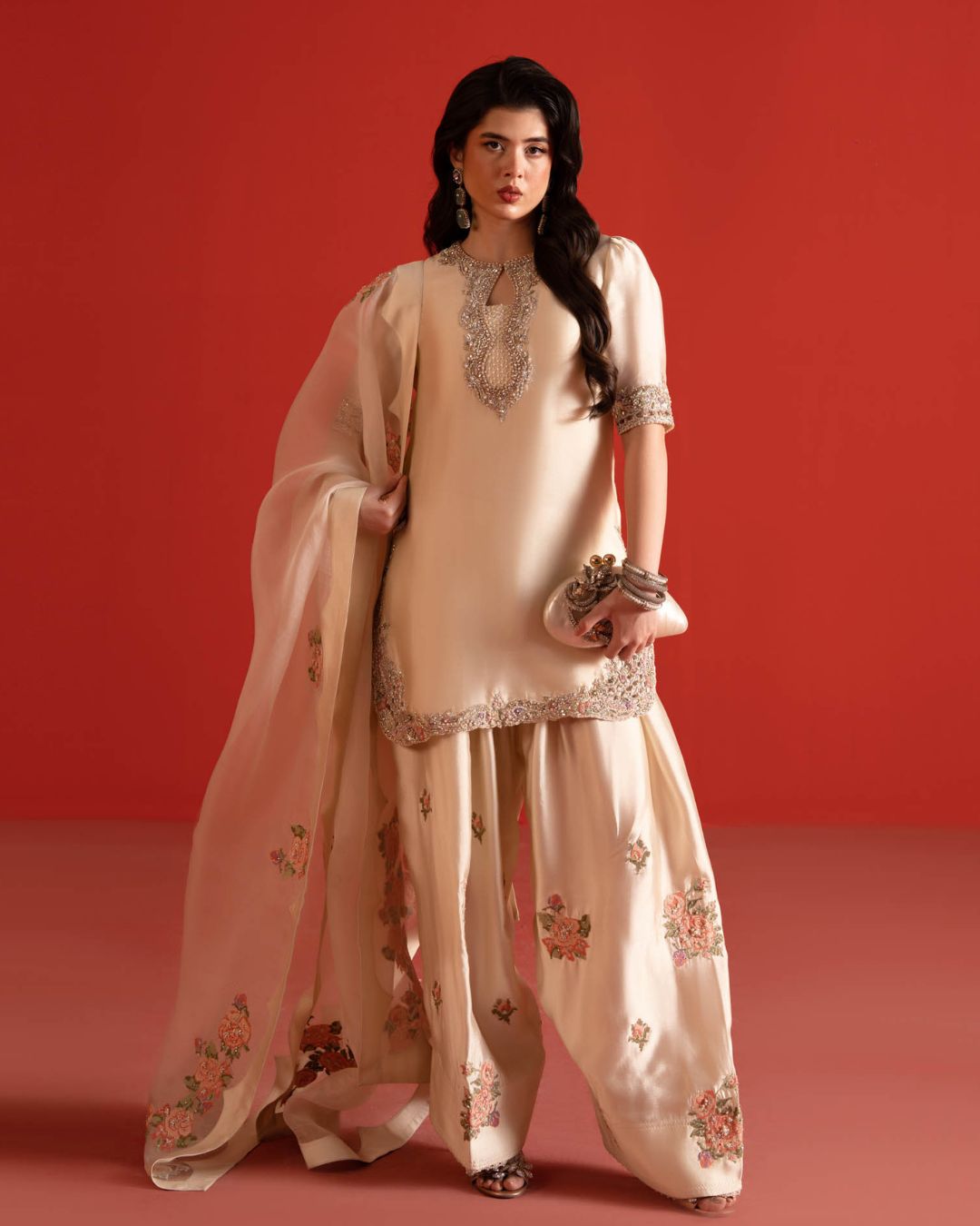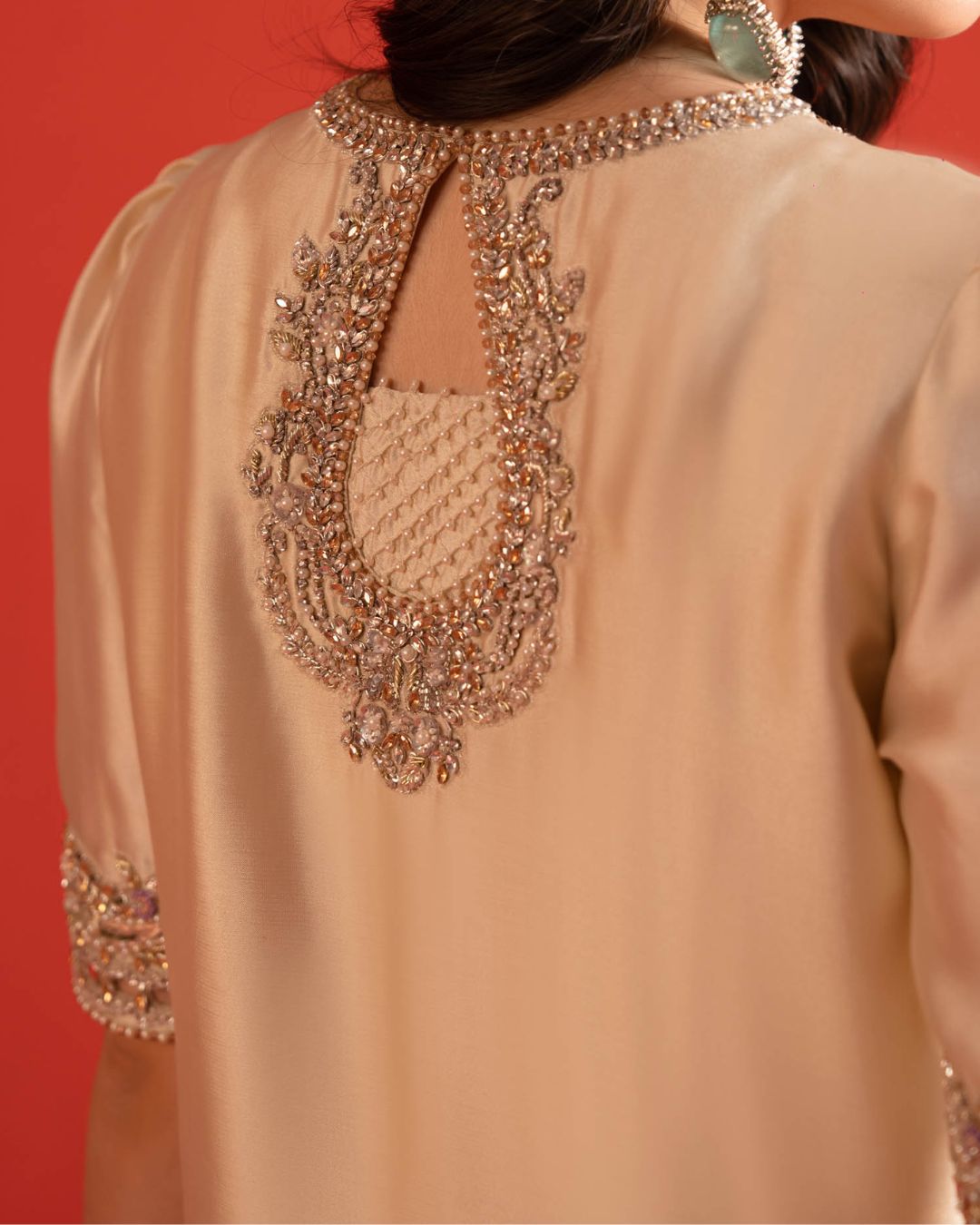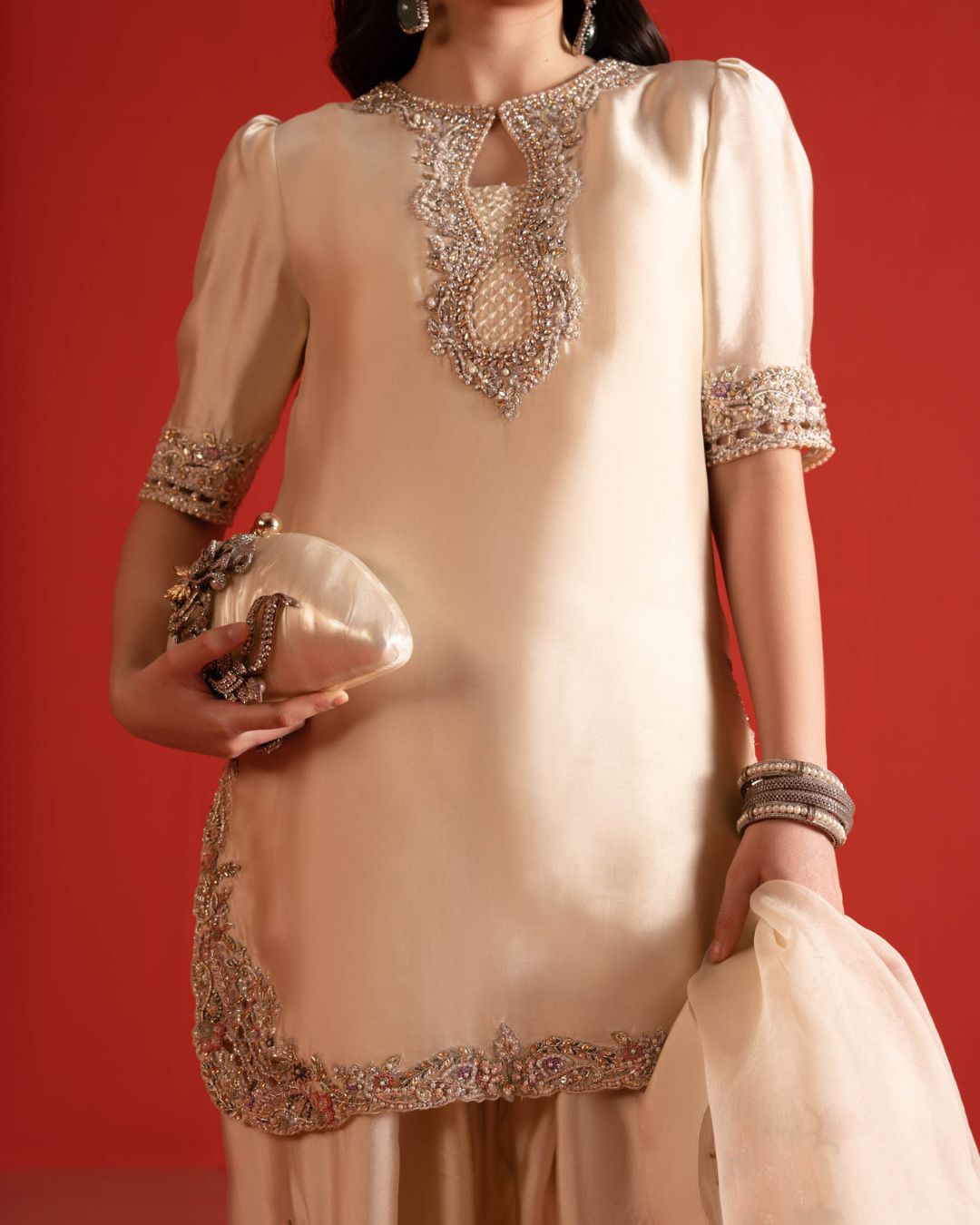 Intricate embroidery winds like sonnets on parchment, kissed with a hush of shimmer,