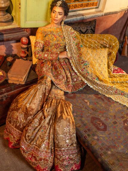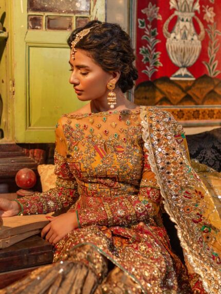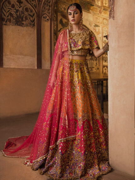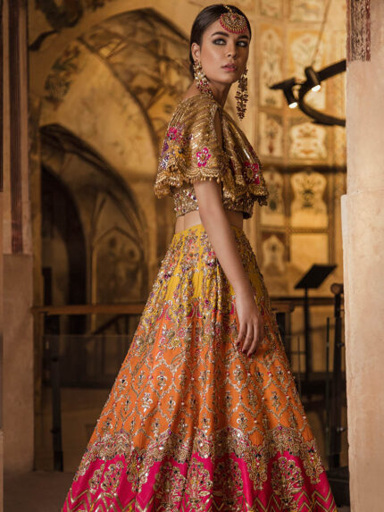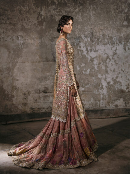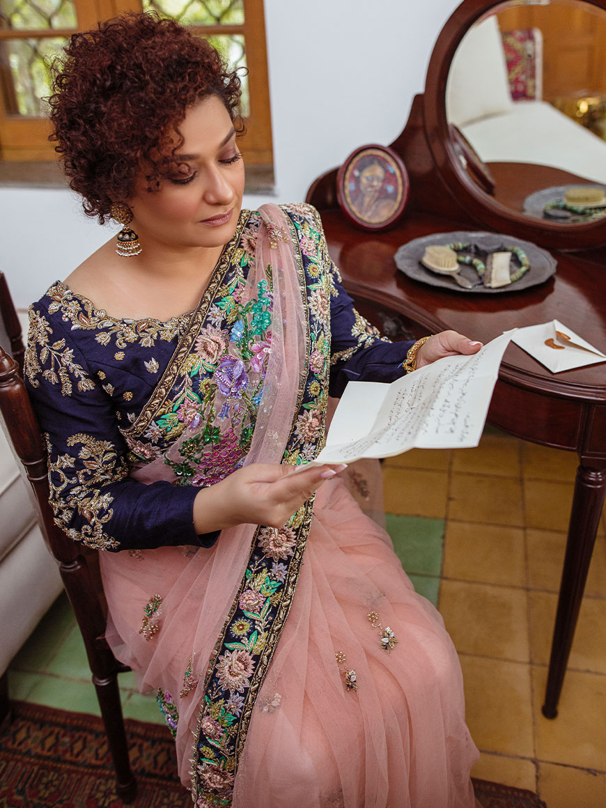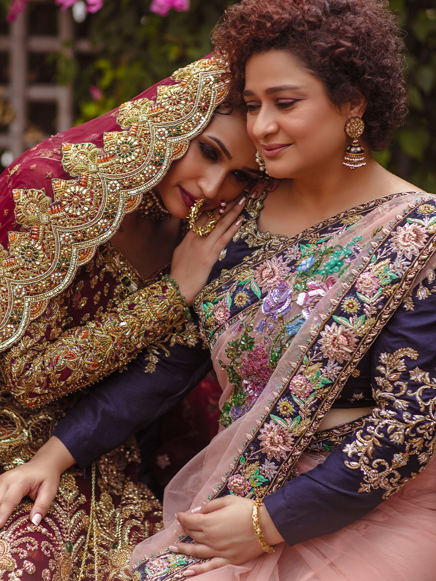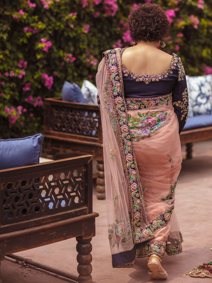This unique fusion composition is composed of dreamy floral details and butterfly motifs that are spread out thoughtfully on the blush pink net canvas. Thick resham floral borders are added all around the saree on a deep navy side base to add contrast to the dreamy floral palette. The fall area is lightly spread with intricate floral and sequin bunches that go all around. Tailored in solid rich navy raw silk, the blouse adds a beautiful strong contrast with its solid baroque ornamental motifs that go around the neckline, bicep, shoulders, and elbows. This saree is perfect for any festive occasion regardless of age group or event. It is a timeless piece worth being an heirloom collectible. (Limited customization available). Fabric = net and satin pattis (saree), pure raw silk (blouse), PK raw silk or zari silk optional (Petticoat).