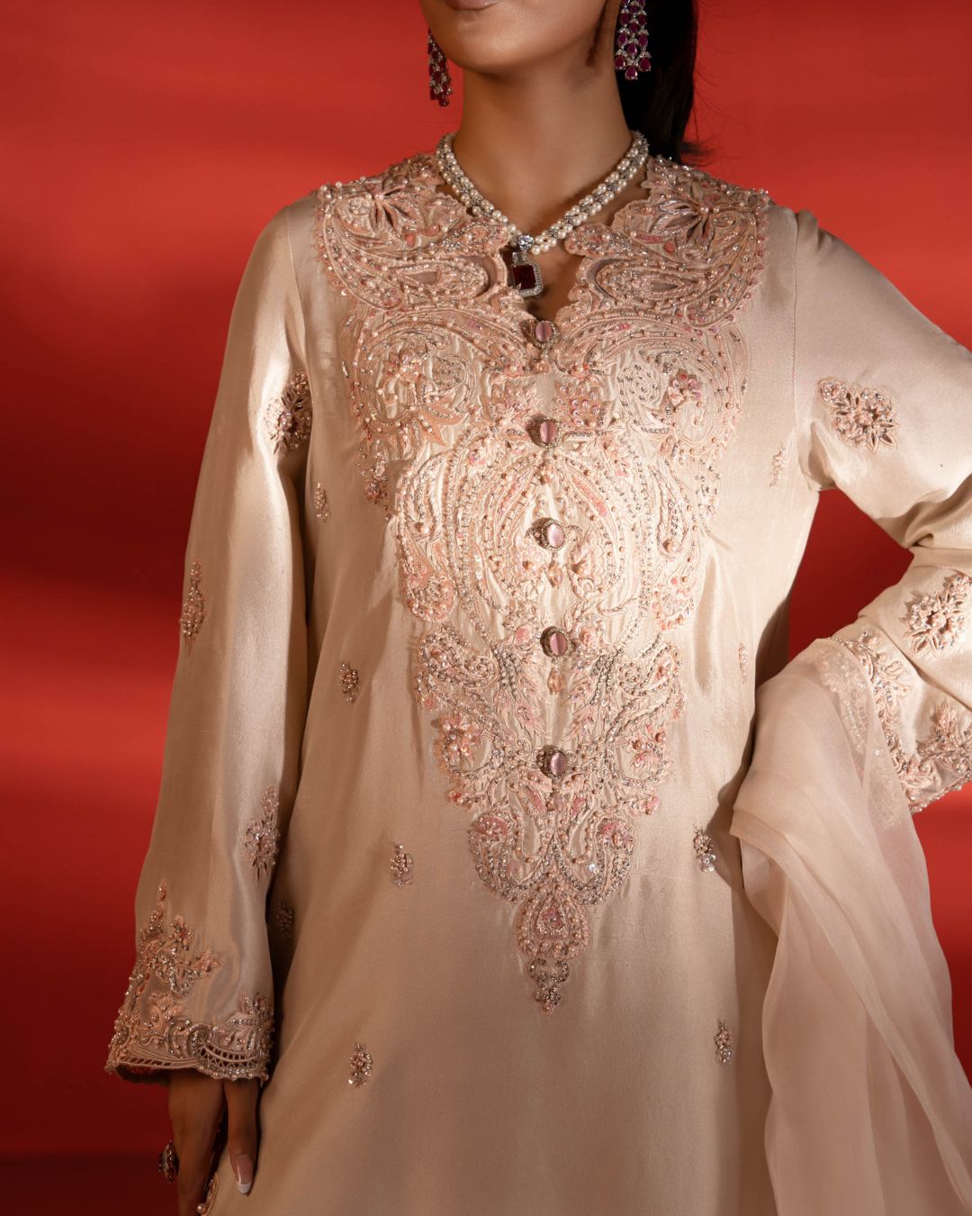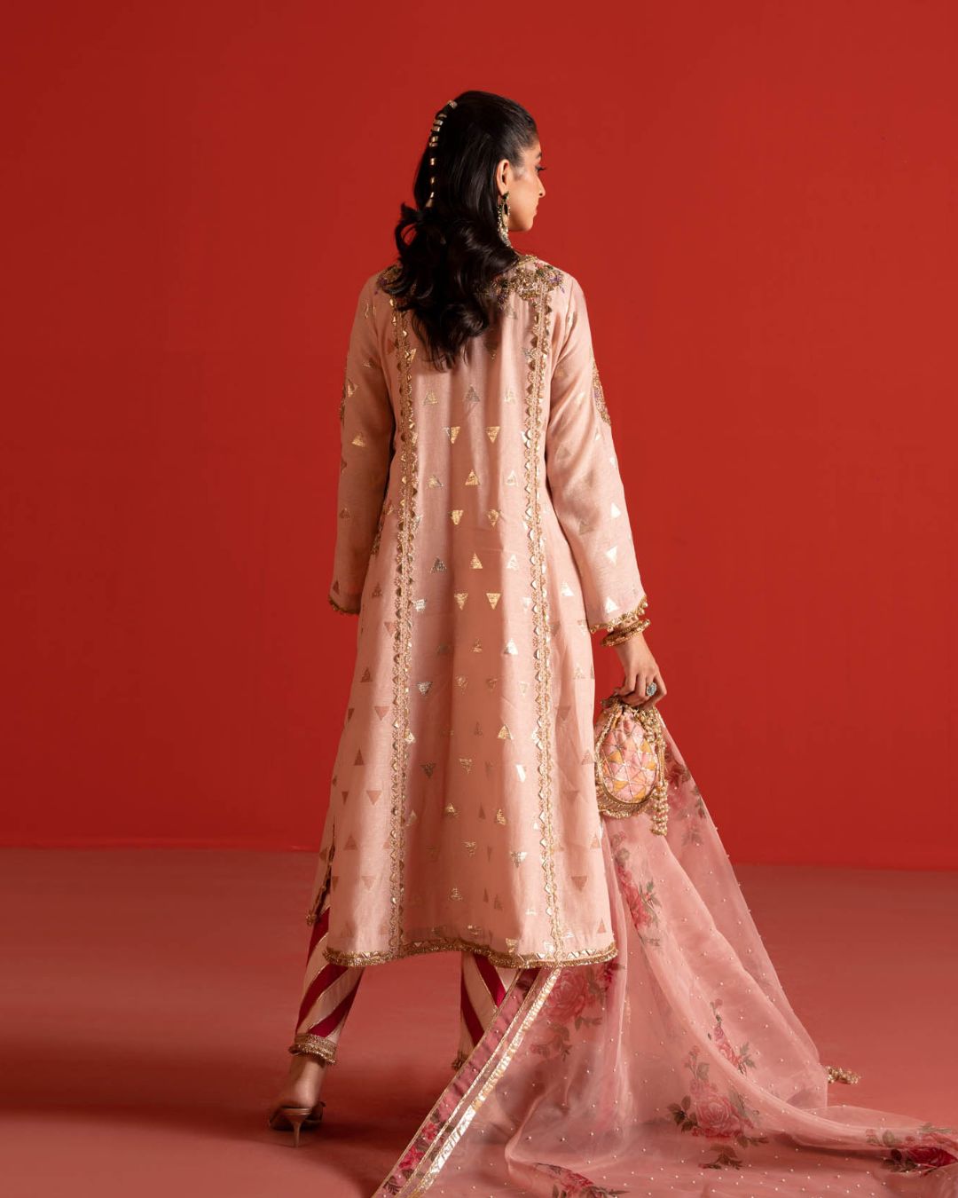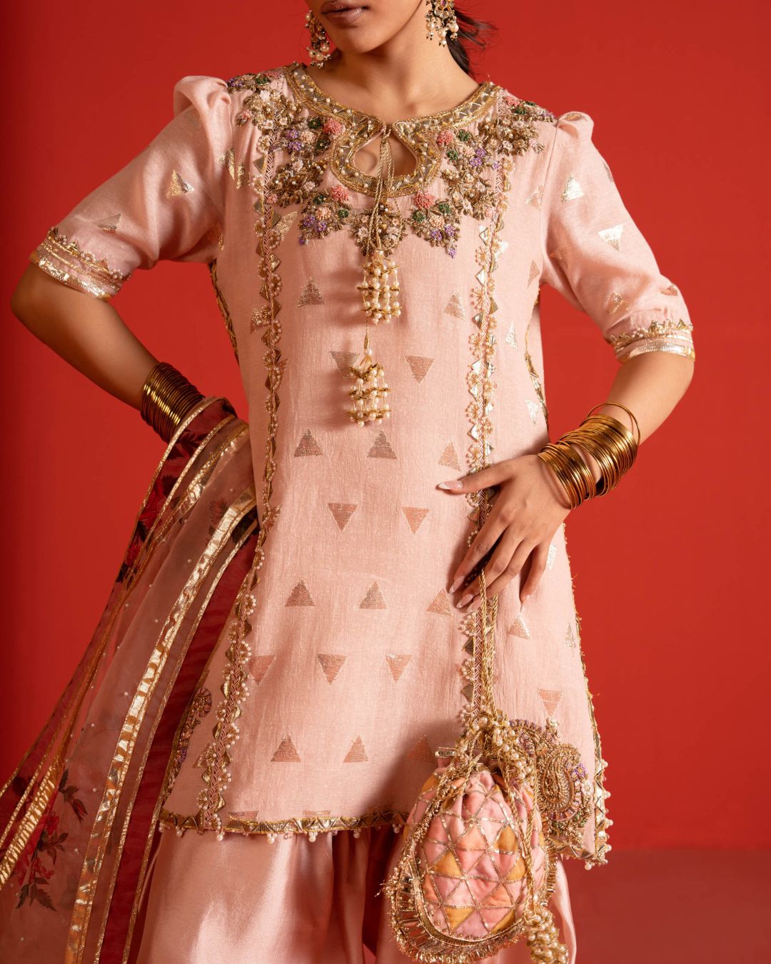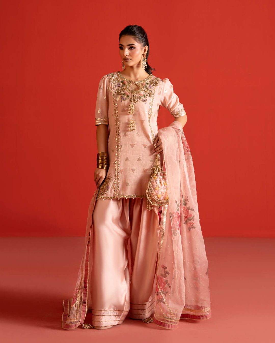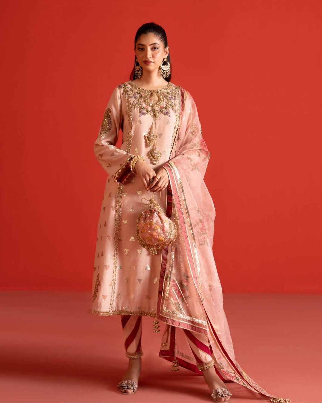 A reverie in blush. This ethereal attire is rendered in a breathable pink canvas, bedecked with resplendent zardozi and opulent gota artistry. Paired with a chatta patti trouser, or a Farshi Shalwar, and a diaphanous printed organza dupatta, it evokes an air of sartorial poetry, where heritage meets haute allure.