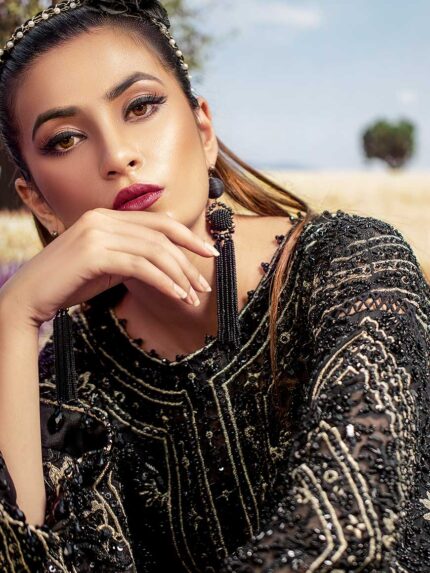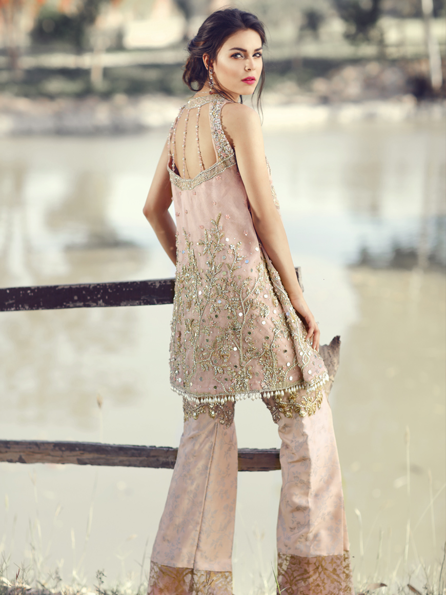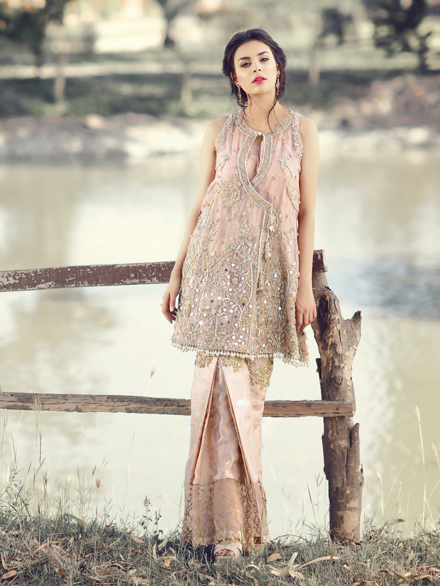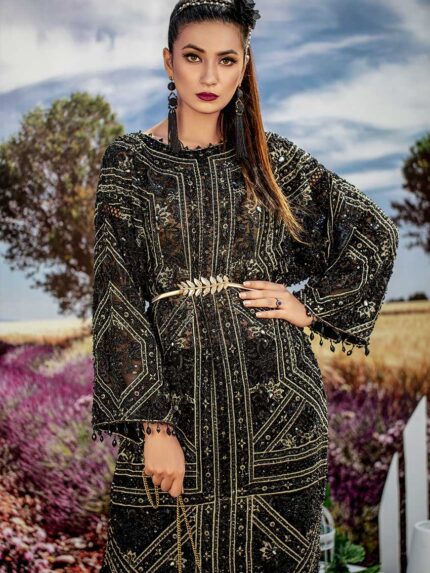 with crystally chiniosery patterns and figurative details, paired with box pleated trousers finished with