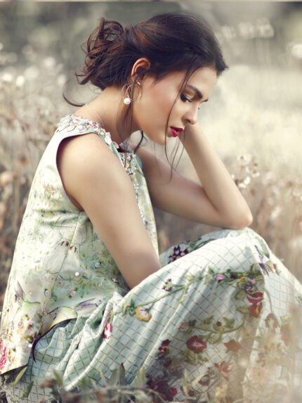 A representation of muse of epic poetry and prose "calliope" is an assymetrical cut flowy short dress,