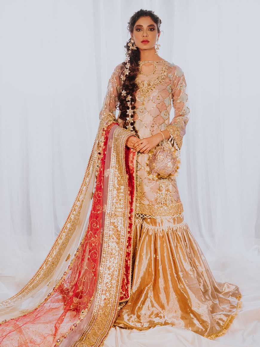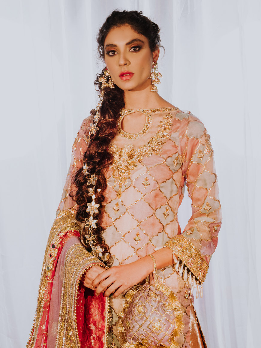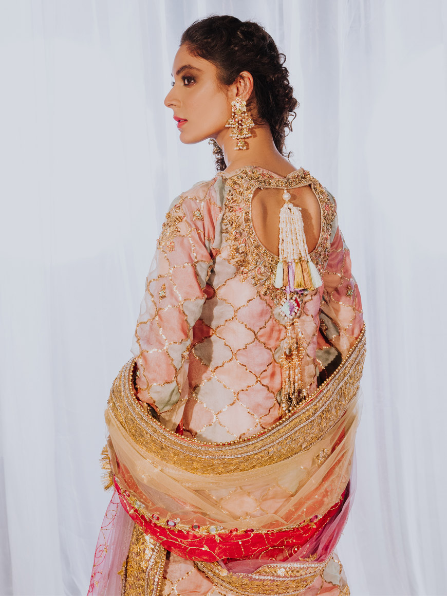 Intricately composed in sheer organza patchwork shirt and timeless gota details, this stunning old school piece will be perfect for a vintage themed event to remember.