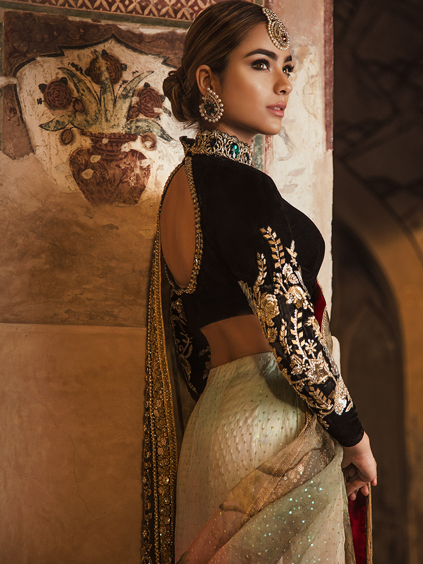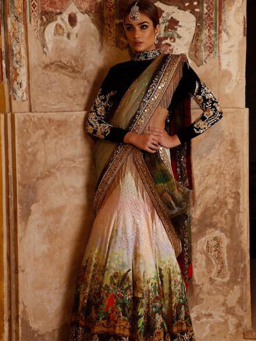 This Screen printed lengha sari depicting Rajasthani folklore blends color and details with sequence and zari embellishments to give a silhouette of opulent royalty.