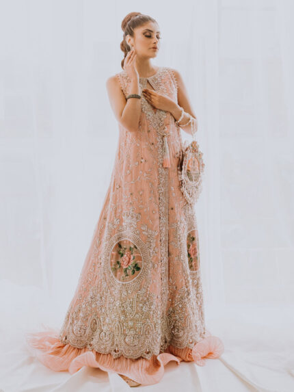 Belted with sheer organza, draped in embroidered fineries and embellished in intricate 3-D flowers this outfit represents the goddess of love and beauty. Soft lavender base dressed in beautiful hues of spring this outfit is perfect of a summer serenade on a romantic evening.