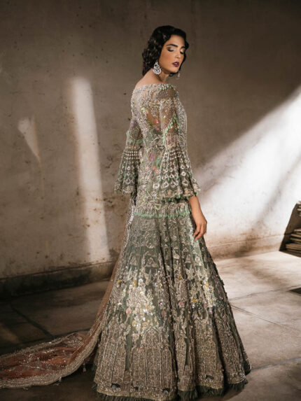 The flattering bodice has a plunging V neckline-thoughtfully composed with motifs to accentuate the feminine curves that transcends into a voluminous kalidaar. This outfit is paired with two options for shawl and dupatta depending on the styling preference. One giving a glamourous shimmery look with heavy floral borders, the other laden with heavy jewel encrusted jaal representing vintage charm.