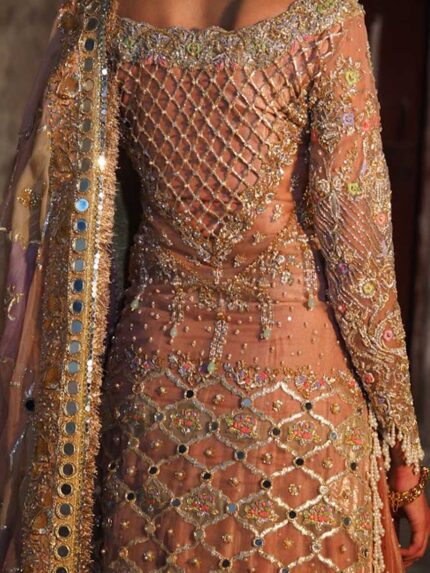 Meraz from 2018 hiraeth collection. Delicately interwoven motifs embellished with zardozi and mirror work. An ode to the olden embellishment techniques of the subcontinent and Mughal India.