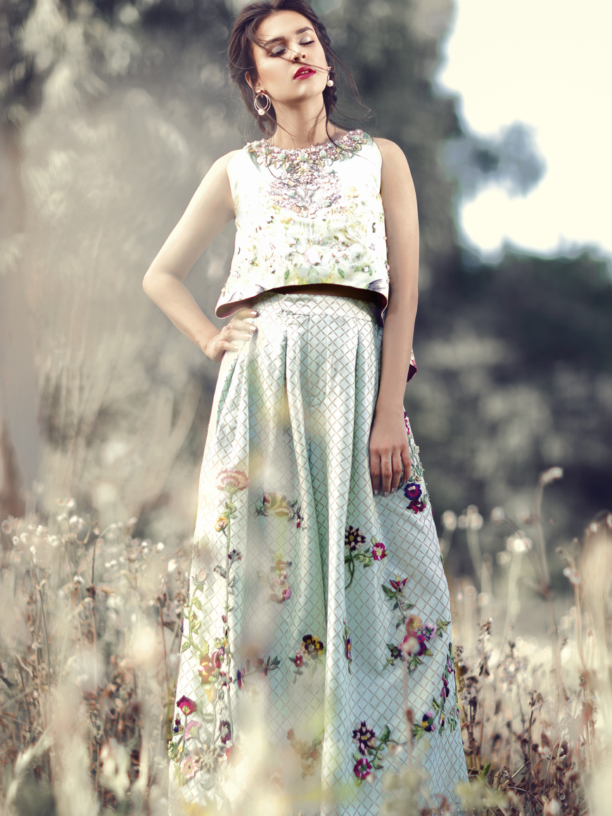 Box pleated culottes tailored to perfection and embroidered with vibrant floral details. Ethereal printed crop top with fine metallic and thread detailing on the neckline. Perfect for an easy breezy outdoor
