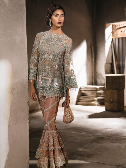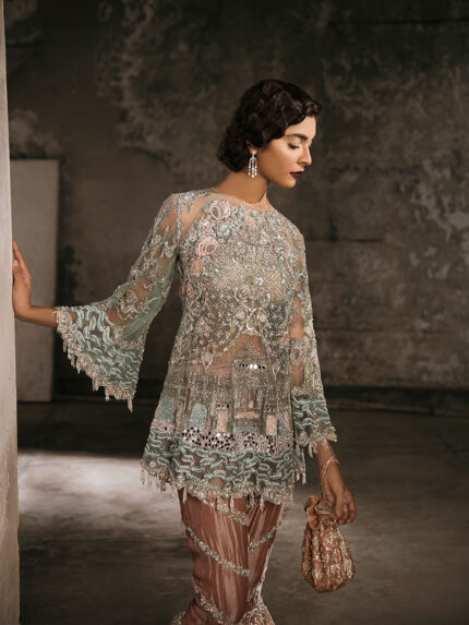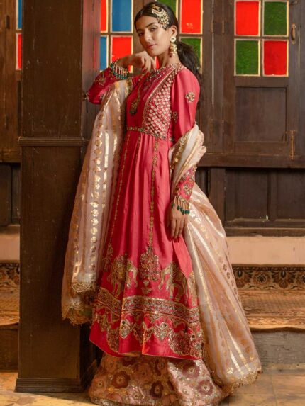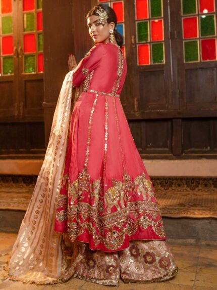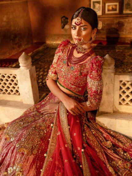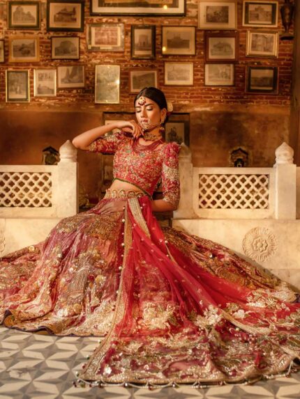 This bridal lehnga is a whole narrative with its eclectic story-like composition including floral and bird motifs. At the bottom of the composition are hand-painted sky frames with 3-D birds and butterflies. Noorah is a 12 colored screen printed and painted base with intricate silver and golden zardozi and Swarovski detailing that go all the way to the bottom where it finishes in a scalloped hemline. The blouse comes in a chequered silver and colored boxy pattern and sleeves composed in diagonal chatta patti dressed in heavy gota, resham and zardozi. The back of the blouse goes into a deep U-shape with a hanging embellished string and ornament. This outfit comes with a traditional 4-side 12 colored pati border scalloped towards the inside of the dupatta with feminine flashes of lilacs and pinks mixed with kanga jamni work. The centre of the dupatta is filled with a generous spray of spade-shaped silver gota. The veil is a grand spread of 8 yards of sheerness delicately circled with a beautifully made zardozi border. The centre is spread with small lilac and pink butterflies and cherry blossom motifs finished with sterling crystal and dabka detailing. (Limited customization options available). Fabric = Raw silk + net (blouse), raw silk (lehnga), net (dupatta), net (veil).