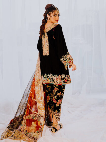 Rosa Bonica – An ethereal white pure organza kalidaar, finished with pearl and 3-D mother of pearl embellishments. Pure Raw silk crushed sharara and floral organza dupatta with laser cut trimmings. A beautiful and breezy outfit suited best for intimate ceremonies at home.